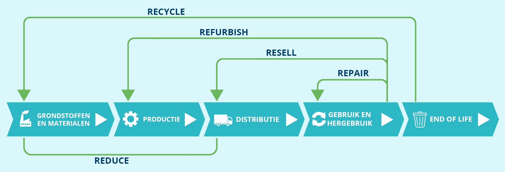 In hoofdlijnen: een merk maakt een circulair product, de consument koopt het circulaire product, de logistiek maakt het mogelijk en de overheid stimuleert circulariteit met incentives.